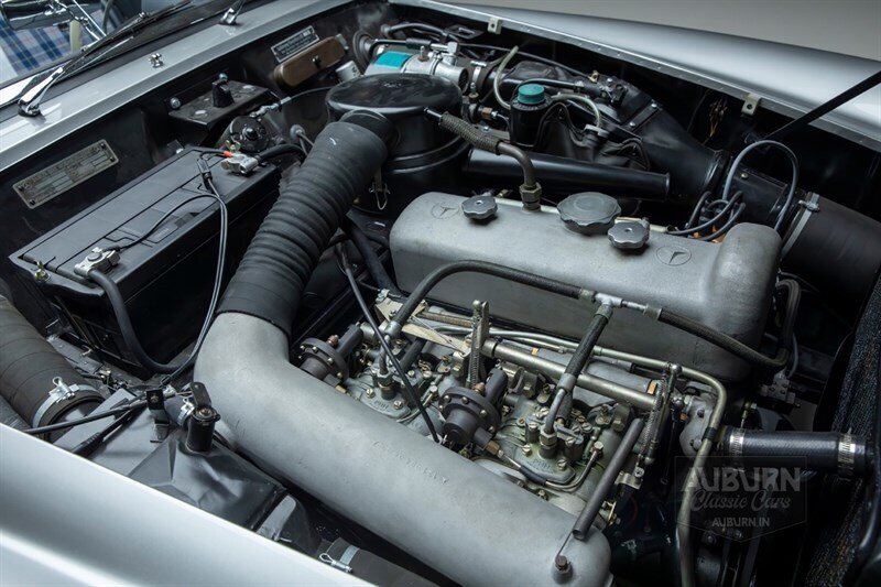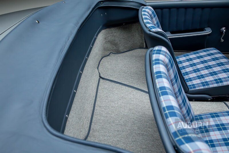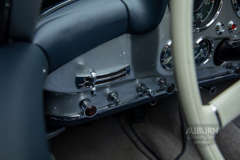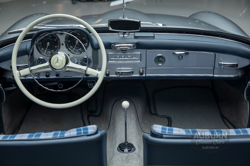 Finished in Silver Grey Metallic, an iconic and period-correct Mercedes-Benz color, the sleek and gleaming Roadster body is complemented by classic whitewall tires and subtle chrome accents. Beneath the folding navy-blue soft top, the “like-new” fully restored interior features gray carpeting with blue piping that matches the door panels, along with the desirable factory-correct tricolor 300SL plaid cloth seats. Favored by collectors and enthusiasts who enjoy touring their 190SLs, these 300SL seats provide a wider, more comfortable fit and lend a sportier element to the car’s already attractive and lustrous presence.