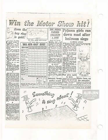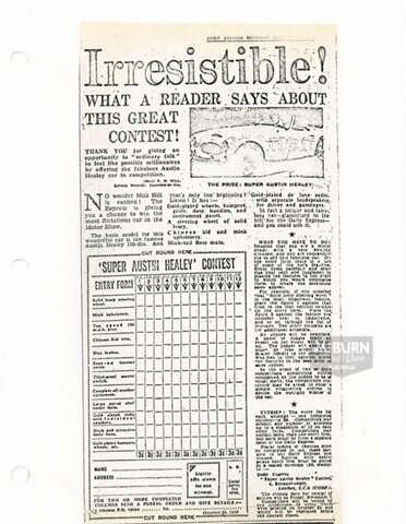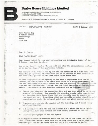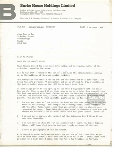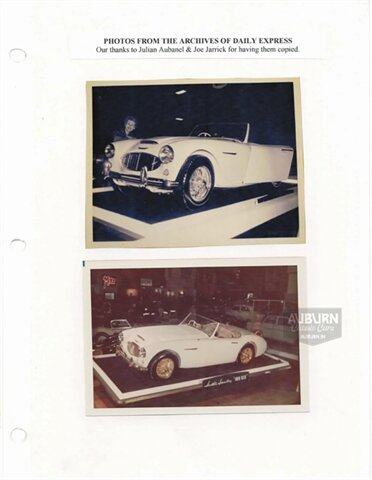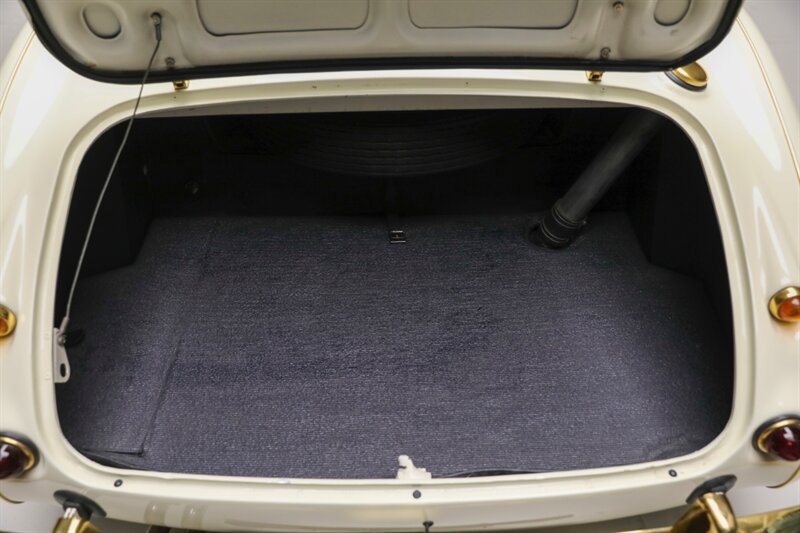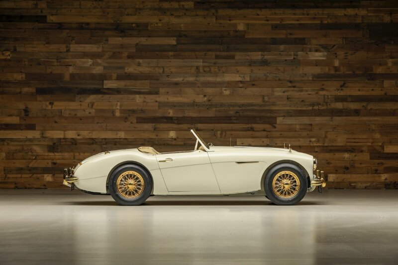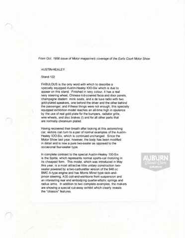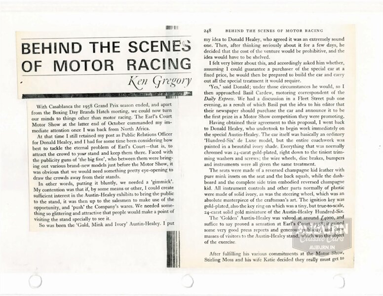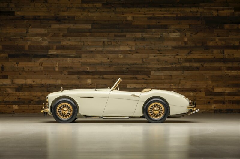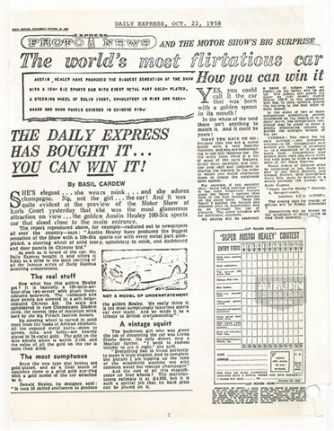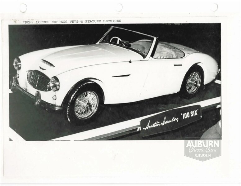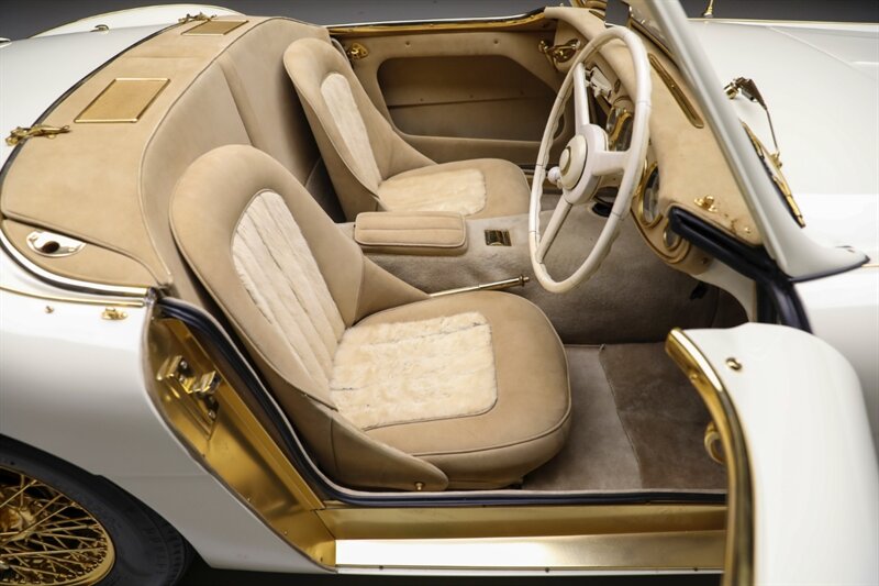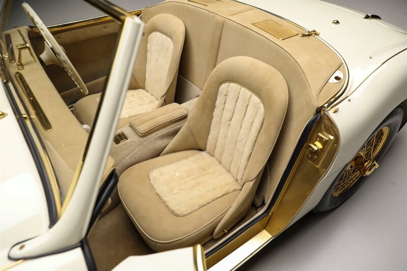 Purpose-built to create excitement on the Austin-Healey stand at the October 1958 London Motor Show at Earls Court, this one-of-one Austin-Healey l00-Six that looks like it holds the key of the “Midas Touch” upstaged Britain's  'Big Five'  / automakers as the unqualified hit of the event.  Today, it remains the most famous example of one of the definitive British sports cars of the 1950s and 1960s.   Featuring audacious gold-plated brightwork, kid leather with mink upholstery, and real ivory controls, this stunning car was conceived by Ken Gregory, Donald Healey's personal public relations manager. As a successful racer, team owner, and former personal manager of none other than Stirling Moss, Mr. Gregory clearly understood that something very special was required at Earls Court to continue captivating Britain's motor journalists and enthusiasts, despite Healey's limited marketing resources.   While Gregory sold Donald Healey on the promotional value of a radically outfitted 100-Six to dominate the floor traffic at Earls Court, Healey quickly reconsidered due to the projected costs.  Undeterred, Gregory persisted and finally obtained Healey's approval, provided a buyer would commit to purchase the car at a fixed price. Following a meeting in a Fleet Street pub with Daily Express motoring correspondent Basil Cardew, who conveyed the proposal to his Editor Tom Blackburn, the newspaper agreed to purchase the show car from Austin-Healey and award it as the grand prize in a contest.   With little time, a regular-production 100-Six (model BN6, Two-seat) Roadster was plucked from the Austin-Healey assembly line and prepared in secret after regular working hours to maximize impact. While essentially stock mechanically, Dunlop four-wheel disc brakes were fitted, making this 100-Six one of the only non-racing Healeys so equipped. Brake servos were also fitted, which were not to become standard until 1964. A special ivory paint finish was applied, and all brightwork was plated in 24-karat gold…” right down to the tiniest trimming washers and screws: the wire wheels, disc brakes, bumpers, and instruments were give the same treatment,” as Gregory later recalled in his autobiography.   The cockpit was similarly flamboyant, with the seats, dashboard, inner doors, and side panels all trimmed in reversed champagne kid leather by Connolly. Luxurious Champagne Diadem Mink by London furrier Lorna Doon Snow adorned the inserts and back squabs of the bucket seats. Genuine Ivory replaced the normal plastic interior parts and control knobs, and the factory steering wheel was replaced by one beautifully fashioned from intricately joined sections of Ivory. Appropriately rounding out the incredible package, the Austin-Healey even included a gold-plated ignition key and key ring, complete with a solid-gold scale replica of the car itself. Valued at approximately £4,000 when new, nearly four times the price of a regular-production 100-Six, the Earls Court Motor Show car was dubbed “the most flirtatious car in the Motor Show” by the Daily Express. Once unveiled, the special Healey achieved its objective and took Earls Court by storm. A steady stream of press reports and excitement around the Daily Express' “Super Austin-Healey” contest, in addition to hordes of onlookers, provided a massive public relations coup for Healey that normal advertising techniques never could.
