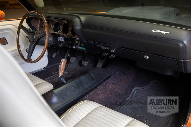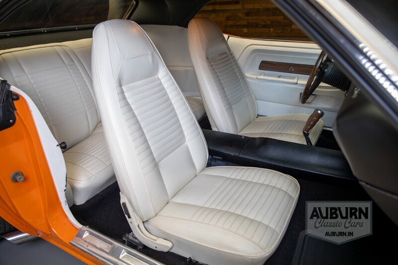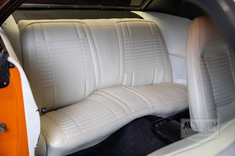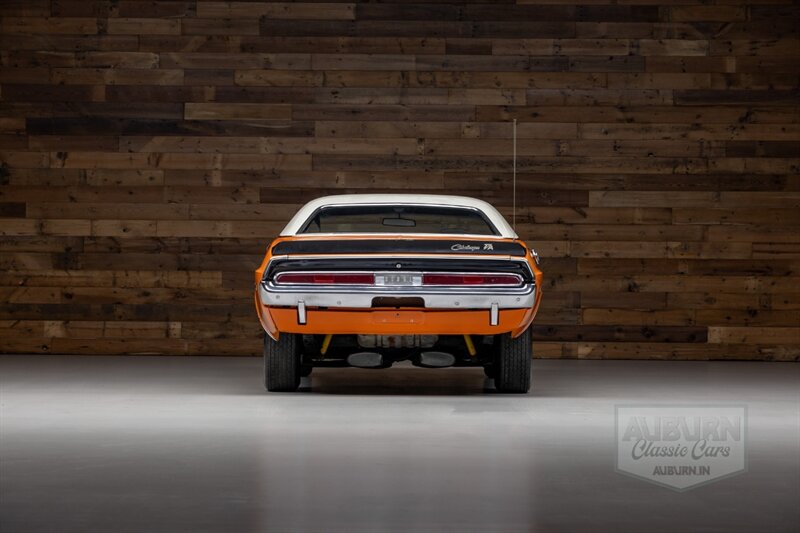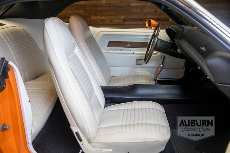 Finished in its original, one of 37 high-impact EK2 Go Mango paint, this Challenger T/A commands attention with its bold presence and perfectly contrasted by a one-of-one white vinyl interior and one-of-one vinyl top that enhances its vintage Mopar appeal. The fiberglass scooped hood, blacked-out T/A graphics, side exhaust pipes, and ducktail rear spoiler further distinguish it as one of the most aggressive muscle cars of its era.